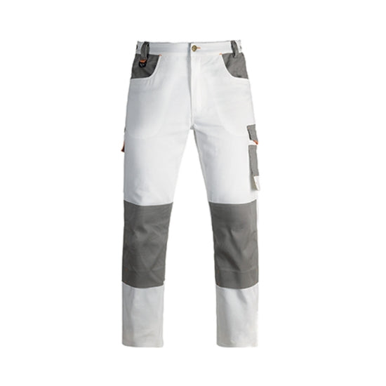 Pantaloni da lavoro bianchi in resistente tessuto elasticizzato, dotati di tasca porta utensili flottante e ginocchia rinforzate con tasca porta ginocchiera. L'elastico in vita migliora il comfort di questi pantaloni da lavoro pensati appositamente per imbianchini e cartongessisti.
