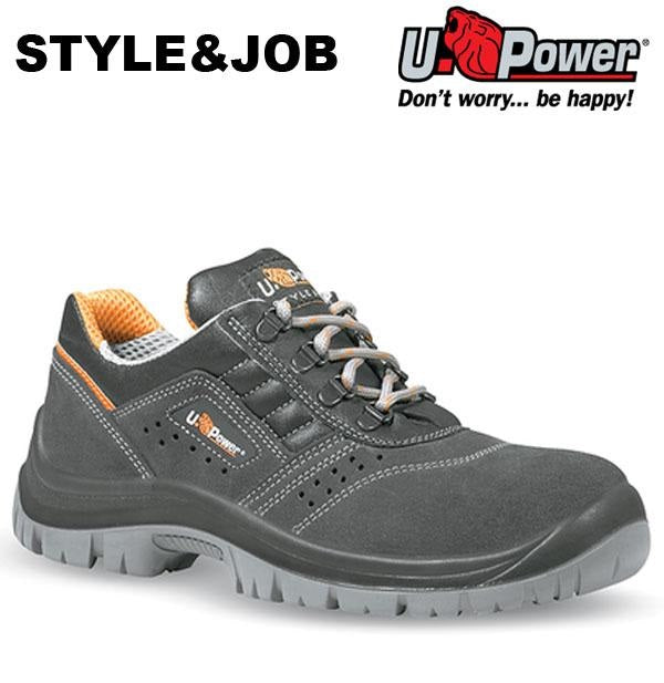 Scarpe antinfortunistiche basse, U-Power della linea Style&Job, con tomaia in pelle scamosciata forata, puntale in acciaio, antiperforazione, antiscivolo, lamina in acciaio ergonomica S1P SRC.